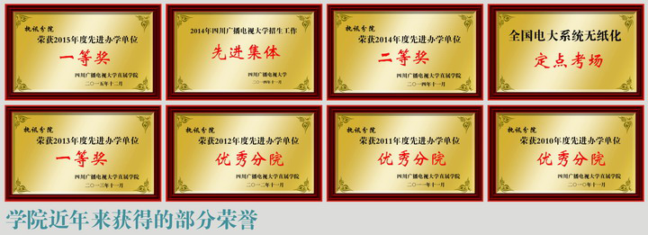 四川开放大学执讯分院多次被评为:“先进办学单位一等奖”“招生先进集体”“优秀分院”等;并拥有先进的办学理念、精湛的教学质量、严谨的教育管理、一流的支持服务、和谐的校园文化、现代的教学设施。选择我校服务优、教学平台优、毕业率高、学位授予率高、收费规范,是提升学历和发展平台佳的好学校;我院热诚欢迎广大求学者前来报读。